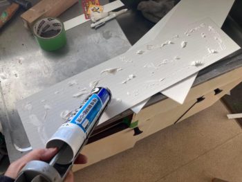 流し台や引き出しの表面パネルの大きさに合わせて手鋸でカットし、シーリングを塗り広く延ばします。