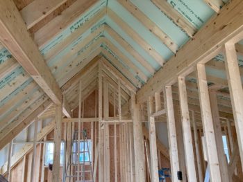 2階は屋根裏空間を居室に使うためツーバイフォー工法で急勾配屋根で組み上げておりトップライトや屋根断熱としていました。