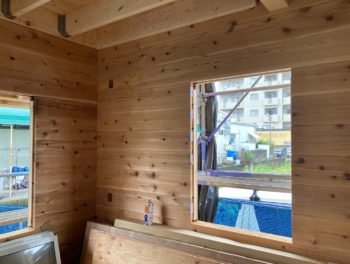 1階部分は角ログという丸太を四角カットした無垢木材を積み上げて家を作る工法です。