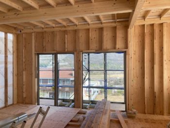 耐力壁は外周部の構造用合板で不足する部分は室内でも構造用合板で耐力を確保しています。