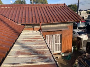岐阜県各務原市の空き家の耐震診断を行った設計者から雨漏りによる腐食があるので補修できるのか見て欲しいと言われ屋根に登って確認しました。