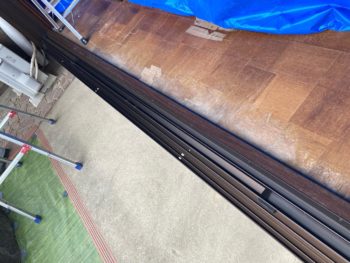 戸袋や雨戸、障子をはめ込んでサッシ工事は完了ですが、外壁を補修するために板金職人さんにも来ていただき施工範囲など打ち合わせしました。