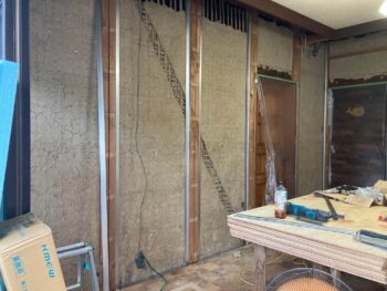 南側のリビングも土壁を残してアルミアングルを柱に取り付け構造用合板を貼る愛知減災協会の認定工法で耐震補強を行なっています。