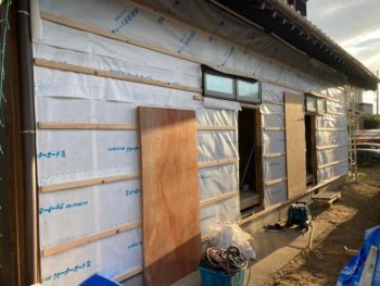 耐震補強で開口部を小さくして耐力壁を増やし、外壁下地を作っています。