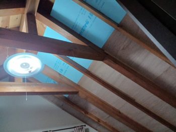 岐阜県郡上市明宝のシェアハウスの勾配天井の断熱工事を行なっています。
