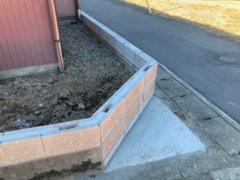 通学路に面する部分は化粧ブロックを積み、通学路でない面は普通ブロックの穴無しタイプです。