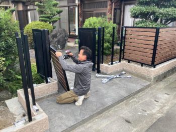 フェンスは杢目シートを貼ったアルミパネルのフェンスでかなり高額な商品ですが、玄関や表の顔となる部分ですのでご了解頂き施工しています。