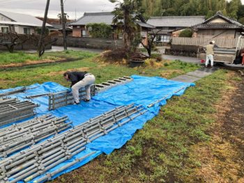 足場の搬入や物置の家具を解体搬出し、屋根のエアコン室外機も撤去するなど準備工事に入りました。