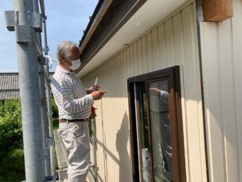 外部では外壁にガルバニウム鋼板を板金職人さんが貼っており、サッシ職人さんが網戸を取り付けて調整しています。
