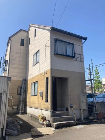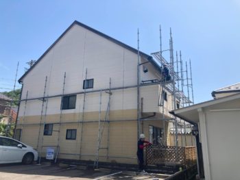 岐阜県各務原市の入居者が決まった空き家の外装塗装工事を行うために足場掛けが始まりました。