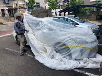 隣地が駐車場のため万が一に塗料が飛散して悲惨なトラブルにならない様に車にも養生カバーを行います。
