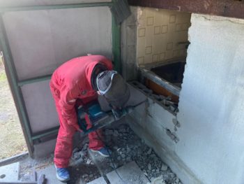 電動ハツリ機で和式トイレの便器や段差部人のタイルやコンクリートを砕いて外部に搬出して、床レベルより低い部分まで砕石をすきとり木床下地が組める様に解体します。