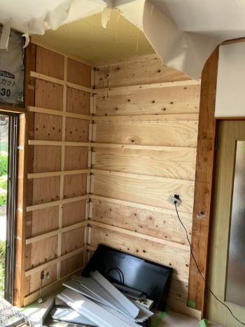また大工さんはリビングの耐震補強工事を行い、壁に耐震補強壁として構造用合板を貼り付けしました。