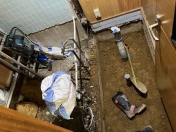 解体工事が終わりトイレの排水配管があらわになりましたが、この排水配管を隣の物入れに配管延長するのを水道職人さんに依頼しています。