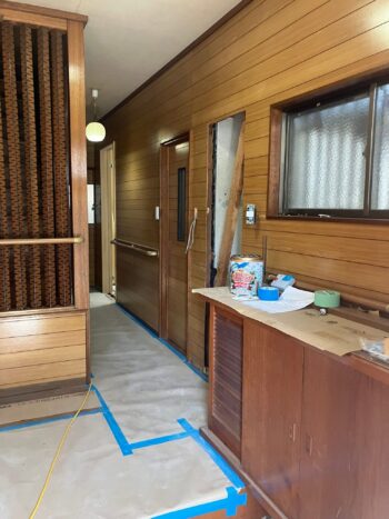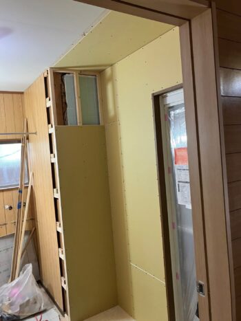 そのユニットバスの入口周りの洗面脱衣室の床壁天井や入口ドアを拡幅して大工さんの造作工事が進んでいます。
