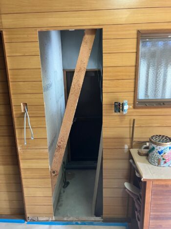 外部からの物入れをトイレにするために室内側に入口を開口しましたが、筋交を撤去して移設予定です。