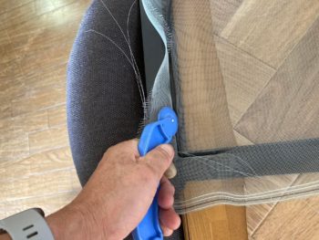 何度もやってるので慣れていますが、押さえゴムを入れる時に網をピンと張って押さえゴムを入れないとシワが寄ってしまうので、そこがポイントですね。