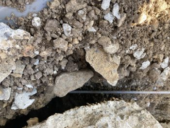 削り後は沈み込んだ空洞に砕石を充填して埋め戻し、排水配管を新たに施工です。