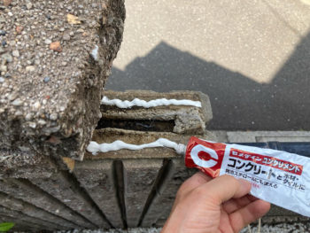 笠木の化粧ブロックを外して砂など掃除をして接着材のコンクリメントチューブから押し出して2列に塗り、あとは外した笠木ブロックを載せるだけで完了です。
