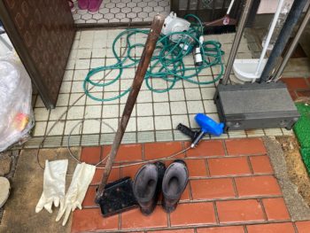 長靴とゴム手袋を装備して排水枡からホースやスプリングケーブルを挿入するが、排水配管が曲がっていると思われる部分で止まってしまい、突き抜ける事ができませんでした。