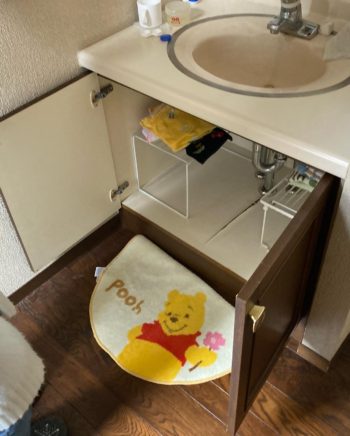 ただ長年の水漏れの影響で洗面台内部の床合板が膨らんで化粧面材がひび割れていました。