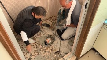 排水ドレンを交換する必要があるとの事で2階浴室の床を削りドレンの撤去作業が始まりました。