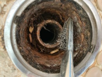 鋳物製の排水ドレン内部の剥離した錆をケレンして磨き、掃除機にガスホースを付けて吸い込み清掃します。