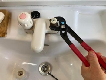 次にプライヤーでナットを回して軸部を取り出してゴムパッキングの付いたコマを外して新品と交換です。