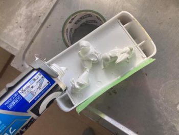そこでシリコンを裏面にたっぷり塗り接着して養生テープで固定して固まるまで待つ事にしました。