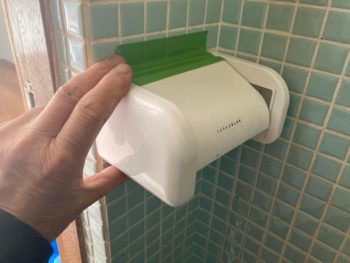 まずはトイレを和式から洋式便座を被せたためトイレの座る方向が反対になり、ペーパーホルダーを新たに取り付けしてありましたが、両面テープで接着してあったため接着力不足で落下していました。
