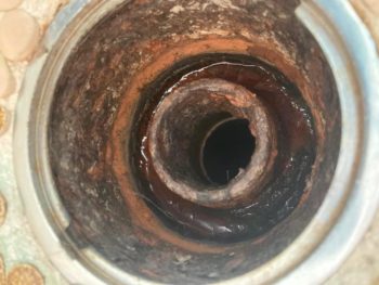 また浴室の排水ドレンも他の部屋で腐食による水漏れがあったので,目皿を外して確認したところ、こちらも鋳物でできたドレン排水なので腐食が進んでいますので修理修繕が必要と判断しました。