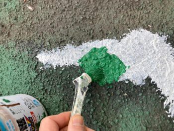 先日、ベランダ床防水塗膜の剥離部分を研磨して下地材のフィラーを塗装しましたが、緑色の仕上げの防水塗料をタッチアップ塗装して完了です。