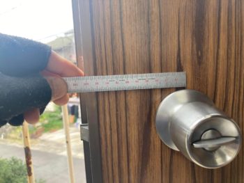 ドアノブを交換するのが一番良い解決方法かと思い、ドア厚やラッチの長さなど各寸法を採寸してきました。