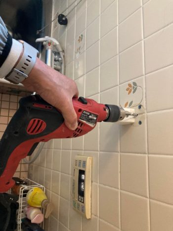 下地がタイルですので振動ドリルにコンクリート用のドリル歯を取り付けて穴を開けます。