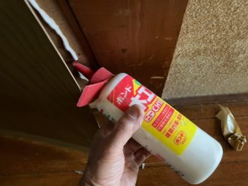 屋根を固定する間の手待ち時間に主屋の階段下収納の扉の表面材が剥離していたので木工ボンドで接着しました。