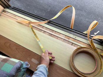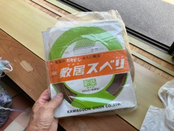 既設の敷居滑りをめくりヘラで付着物を撤去した後に新しい敷居滑りを貼っていきます。