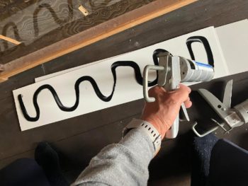 また寝室の作り付け洋服タンスの引き出し部のメラミン材も剥離していましたので、白い樹脂板をカットしてシーリング材で接着しました。