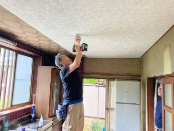 DKの天井に吸音テックスを貼っていきます。