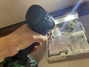 まずは民泊の避難誘導灯の表示パネルを外して、固定しているビスを抜いて器具を取り外しました。