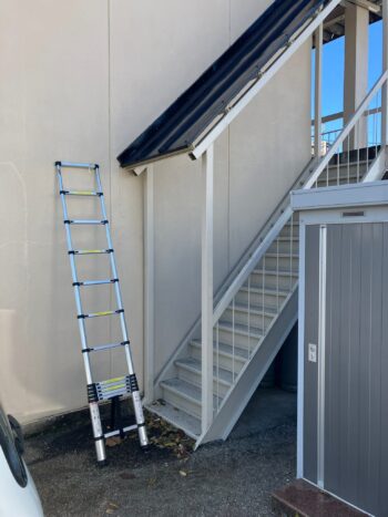 伸縮ハシゴを伸ばして雨漏りの原因を確認