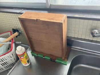 昨日の「押入れ床ベニアの剥離修理」に続き、本日は**「流し台の面材(エプロン・引き出し)の剥離補修」**です。