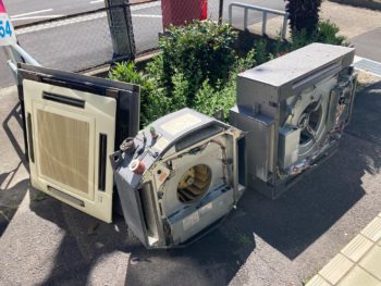 先日の店舗解体現場から救助した業務用天井カセットエアコンを事務所に保管しておりましたが、やっと職人さんの手が空いたので取り替え工事を行いました。