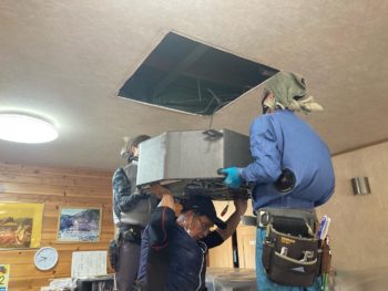 天井に埋め込まれた室内機のカバーを外し冷媒配管や結露水の排水配管を外してボルトを緩めて室内機を下ろします。