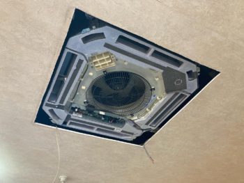 解体予定の店舗から救助してきた業務用天井カセット省エネエアコンを弊社事務所の30年前の冷房専用クーラー4台と交換しました。