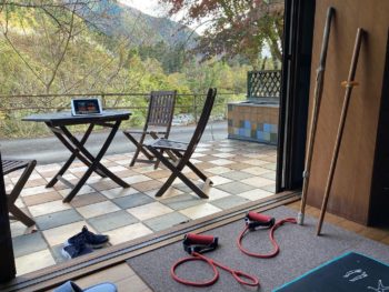 離れの前のタイル貼りテラスにはウッドチェアとウッドテーブルを置き、大自然の中で珈琲を飲み、ゆったりとワーケーションができる様に整備できましたのでご利用下さいね。