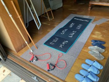 私が昔使っていたゴムでを伸ばして筋トレする道具や竹刀やストレッチマットを置いてみました。