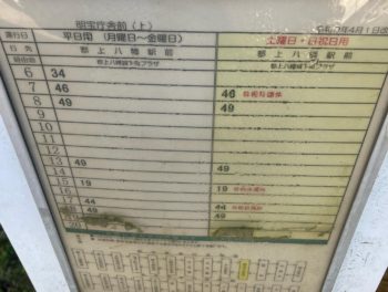 このバス停までは郡上八幡から八幡バスが運行していますが、1日7本しかありません。