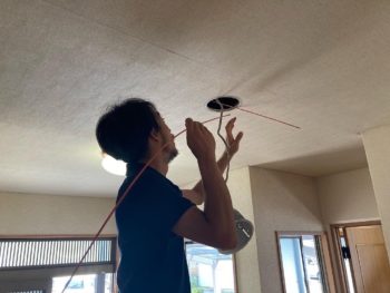 電気職人さんには配電盤から新たにエアコン配線を追加してもらいましたが、ダウンライトの穴を使ったり新たに穴を開口したり配線を露出させないように苦労されていました。