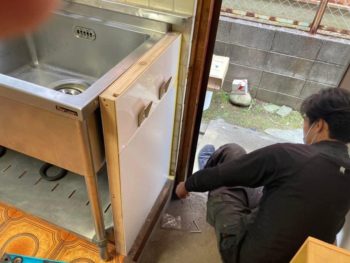 設置場所を水道職人さんと打ち合わせた結果、流し台の給水と排水を利用するのが効率が良いとの事でしたので流し台の横に設置する事にしました。