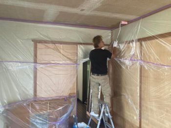 床はブルーシートで養生し、壁はマスカーというビニールにテープの付いた養生材で保護して塗装です。